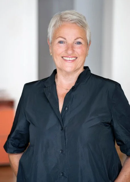 Eine lächelnde freundliche Frau mit kurzen grauen Haaren, trägt eine schwarze Bluse, steht in einem modernen Raum.